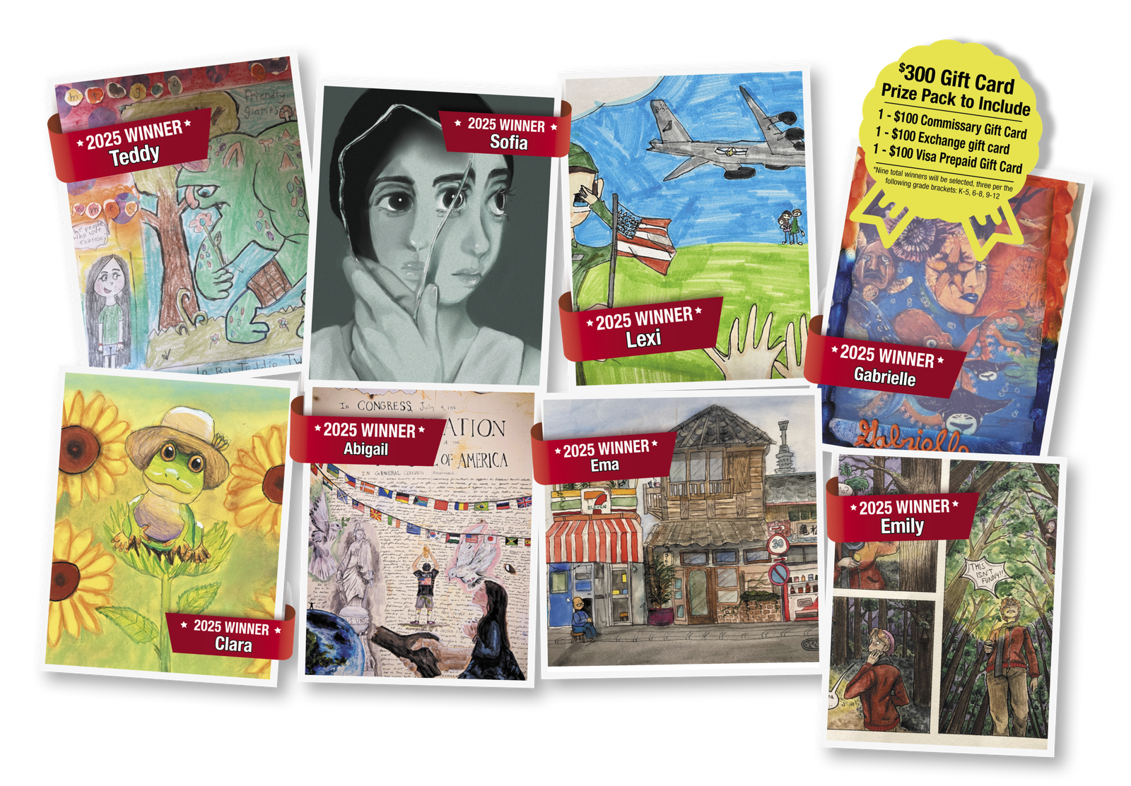 Nine (9) total winners will be selected - three (3) per grade bracket: K-5, 6-8, and 9-12. Each will receive a $300 Gift Card Prize Pack to include